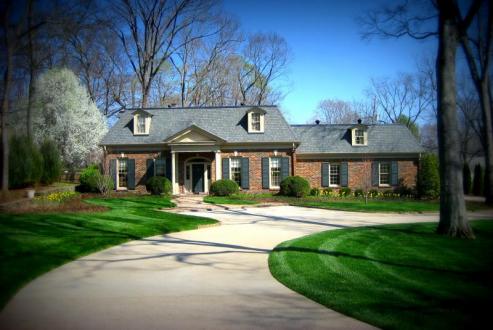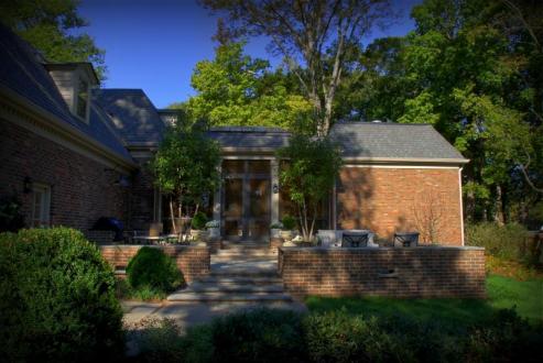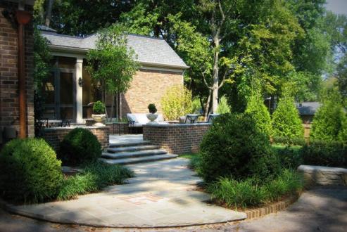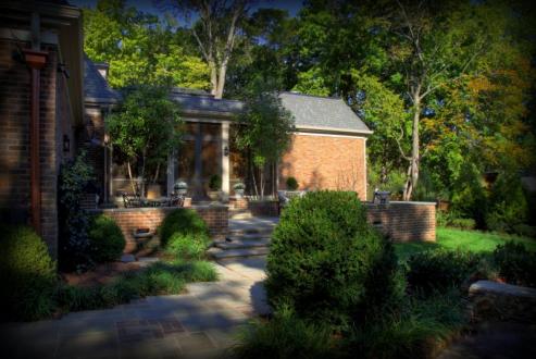 The architect approached us to resolve the transition from the proposed screen porch addition to the existing drive. A door from the garage to the outdoors was complicating the transition from the porch to existing grade. Isaac suggested the door be relocated, the remaining aperture be bricked up, and introduced an outdoor dining area with a built-in grill. Large, overgrown trees were removed to open up the backyard, with screen plantings added to augment privacy. Large Sweetbay Magnolias were brought in to instantly transform this porch and terrace into what the owner describes as a “constant vacation getaway.” The second phase of this project entailed the removal of the oversized asphalt drive and replacement with a more purposeful and useable one made of sand-blasted concrete. Phase two also included the addition of an arrival court with a new brick entry walk and curb. Unsightly plant materials were removed, large swathes of groundcover were introduced, and the arrival court was punctuated with groupings of Hydrangea and small flowering trees.