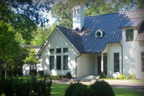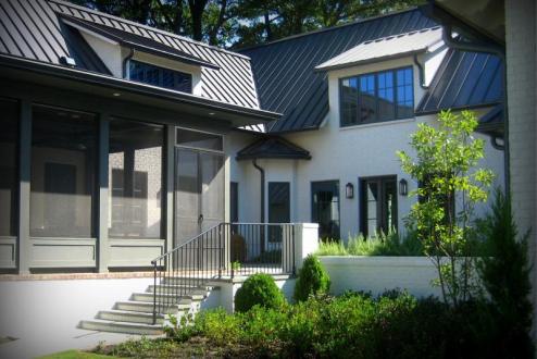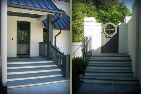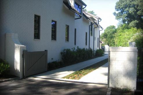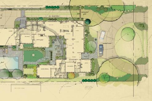 The owners and architect worked diligently to make this home comfortable and casual. The landscape reflects the same. An asymmetrical arrival court allows parking for multiple cars, while allowing ease of egress with a loop drive. A two-track drive leads to the service court, providing opportunity for water infiltration. Working with the architect, we transitioned the rear terrace down to grade level with a comfortable run of steps into a path of stepping stones. The pool is located so as to provide the owners with views of the children from many vantage points within the home, while allowing the rear of the property to serve as an informal adventureland: with a tree-house, zipline, and playset. A large swath of lawn was preserved for backyard sports.