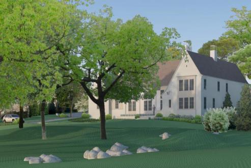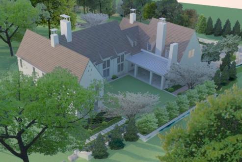 The site plan for this simple, elegant home demanded an excercise in restraint. Paramount was nestling the home into the rolling topography and working around established groves of hickory and oak, all while respecting established drainage patterns and the greater watershed. Several 3-D models were completed to finally arrive at the perfect finished floor elevation to allow the best siting for views as well as to minimize retaining wall heights. The arrival motorcourt was planned with a shoot and chip surface and a cobblestone curb, with a majority of the plantings being groundcover and boxwood. The rear courtyard, initially planned as a pool terrace, is bounded by box hedge and a hornbeam bosque and also contains plantings of hydrangea and lavender; while a side lawn was reserved for more active play. Wantland Ink represented the owner before the Forest Hills Board of Zoning Appeals, which passed the project upon initial hearing. Construction to commence in Fall 2012.