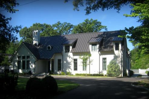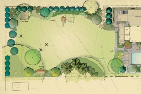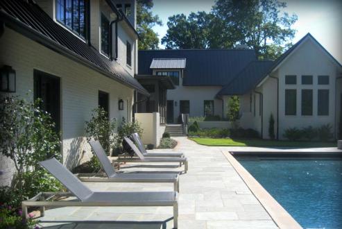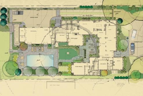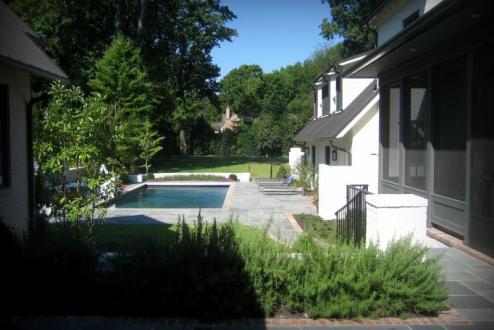 The owners and architect worked diligently to make this home comfortable and casual. The landscape reflects the same. An asymmetrical arrival court allows parking for multiple cars, while allowing ease of egress with a loop drive. A two-track drive leads to the service court, providing opportunity for water infiltration. Working with the architect, we transitioned the rear terrace down to grade level with a comfortable run of steps into a path of stepping stones. The pool is located so as to provide the owners with views of the children from many vantage points within the home, while allowing the rear of the property to serve as an informal adventureland: with a tree-house, zipline, and playset. A large swath of lawn was preserved for backyard sports.