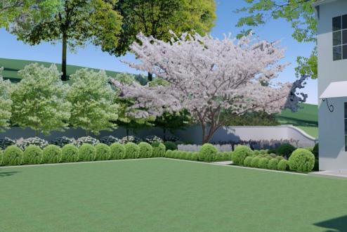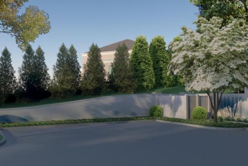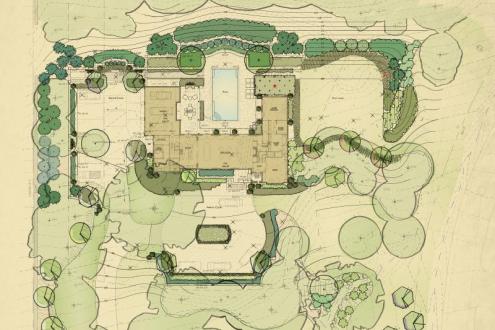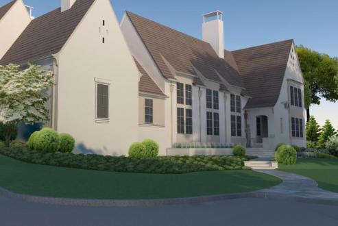The site plan for this simple, elegant home demanded an excercise in restraint. Paramount was nestling the home into the rolling topography and working around established groves of hickory and oak, all while respecting established drainage patterns and the greater watershed. Several 3-D models were completed to finally arrive at the perfect finished floor elevation to allow the best siting for views as well as to minimize retaining wall heights. The arrival motorcourt was planned with a shoot and chip surface and a cobblestone curb, with a majority of the plantings being groundcover and boxwood. The rear courtyard, initially planned as a pool terrace, is bounded by box hedge and a hornbeam bosque and also contains plantings of hydrangea and lavender; while a side lawn was reserved for more active play. Wantland Ink represented the owner before the Forest Hills Board of Zoning Appeals, which passed the project upon initial hearing. Construction to commence in Fall 2012.